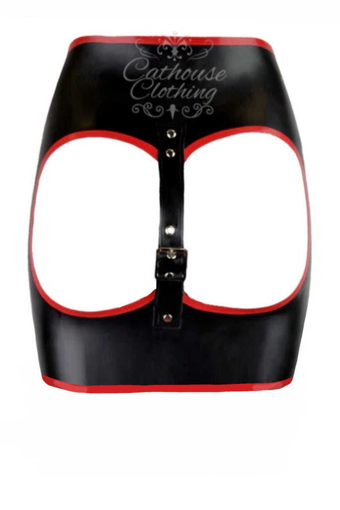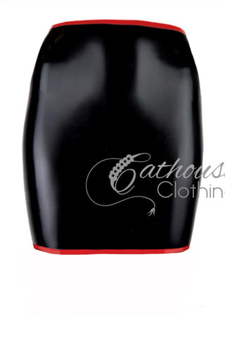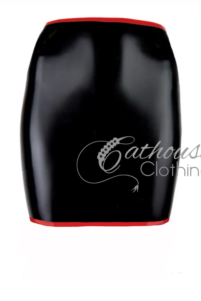 Black latex mini skirt with cut-out bottom and adjustable strap. Contrast edging. No zip. Shown with red edging.