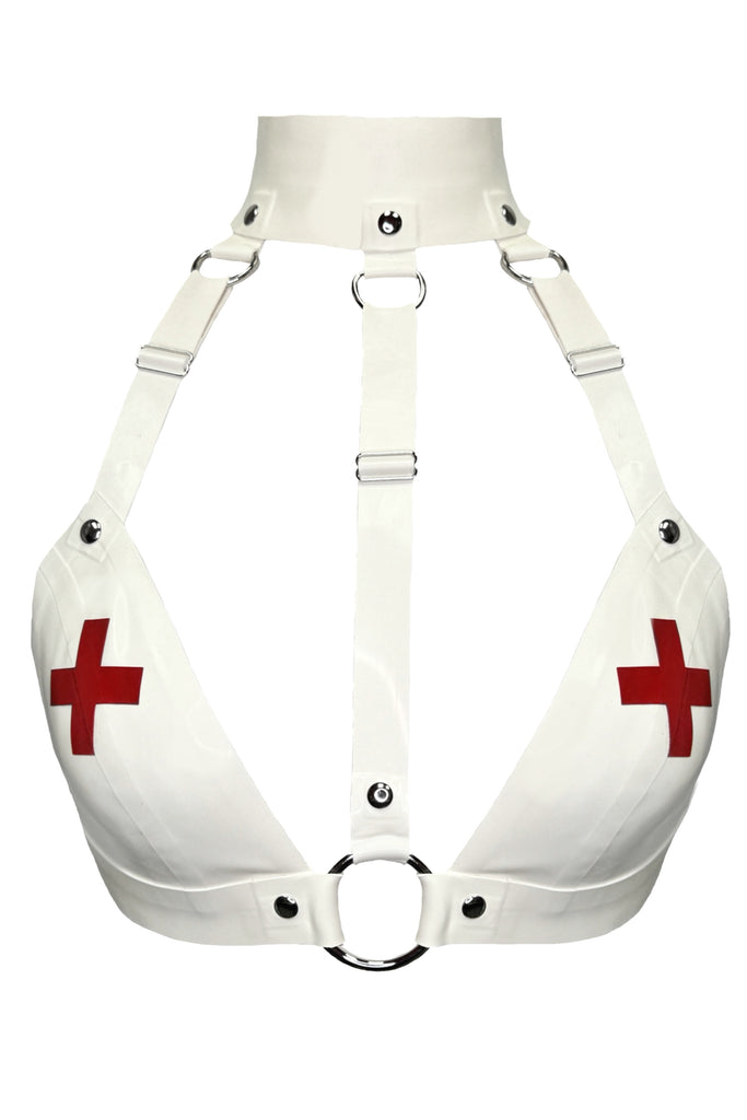 Latex halterneck bikini bra with harness and ring detail. Clinic crosses on the cups. Press stud fastening